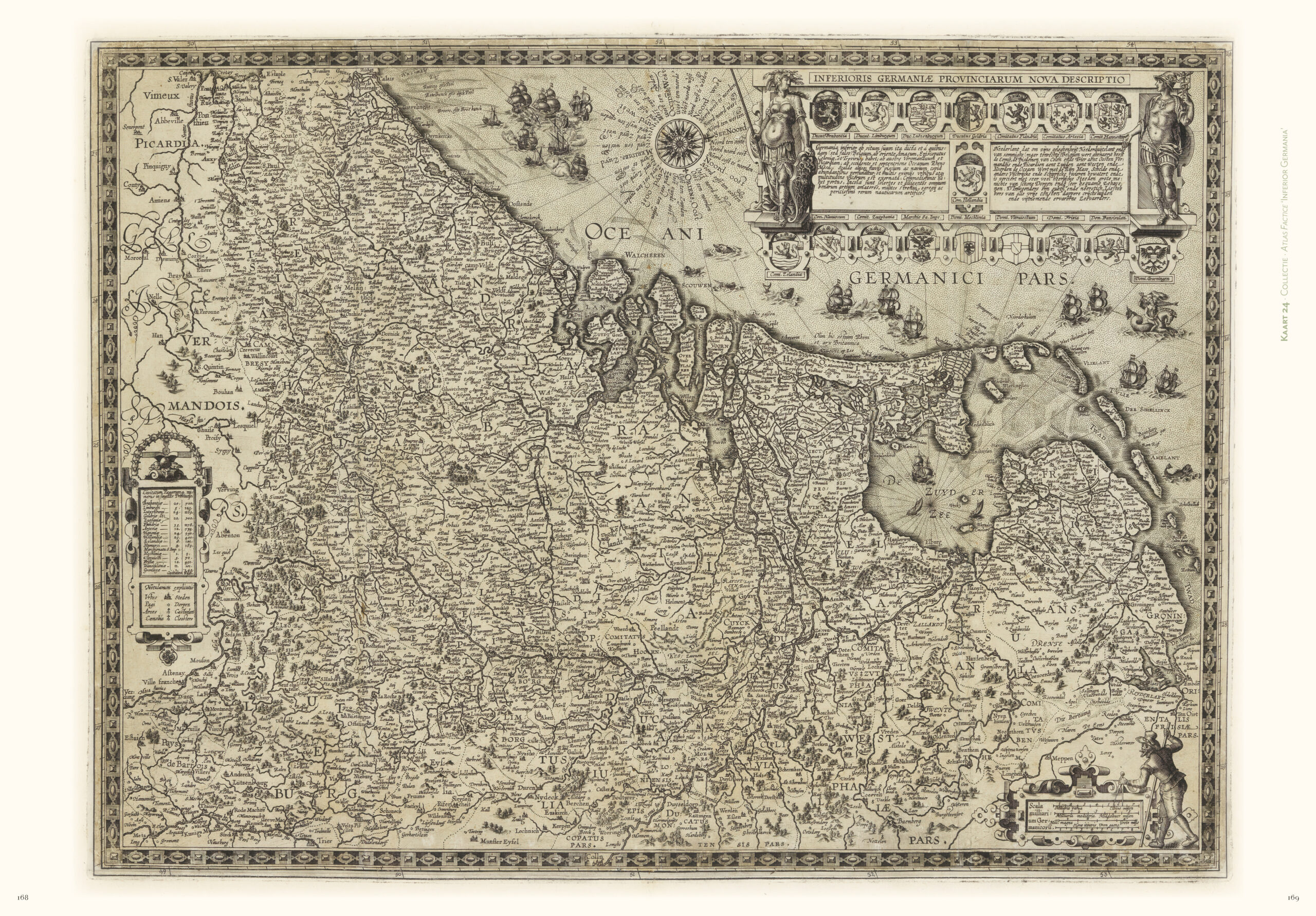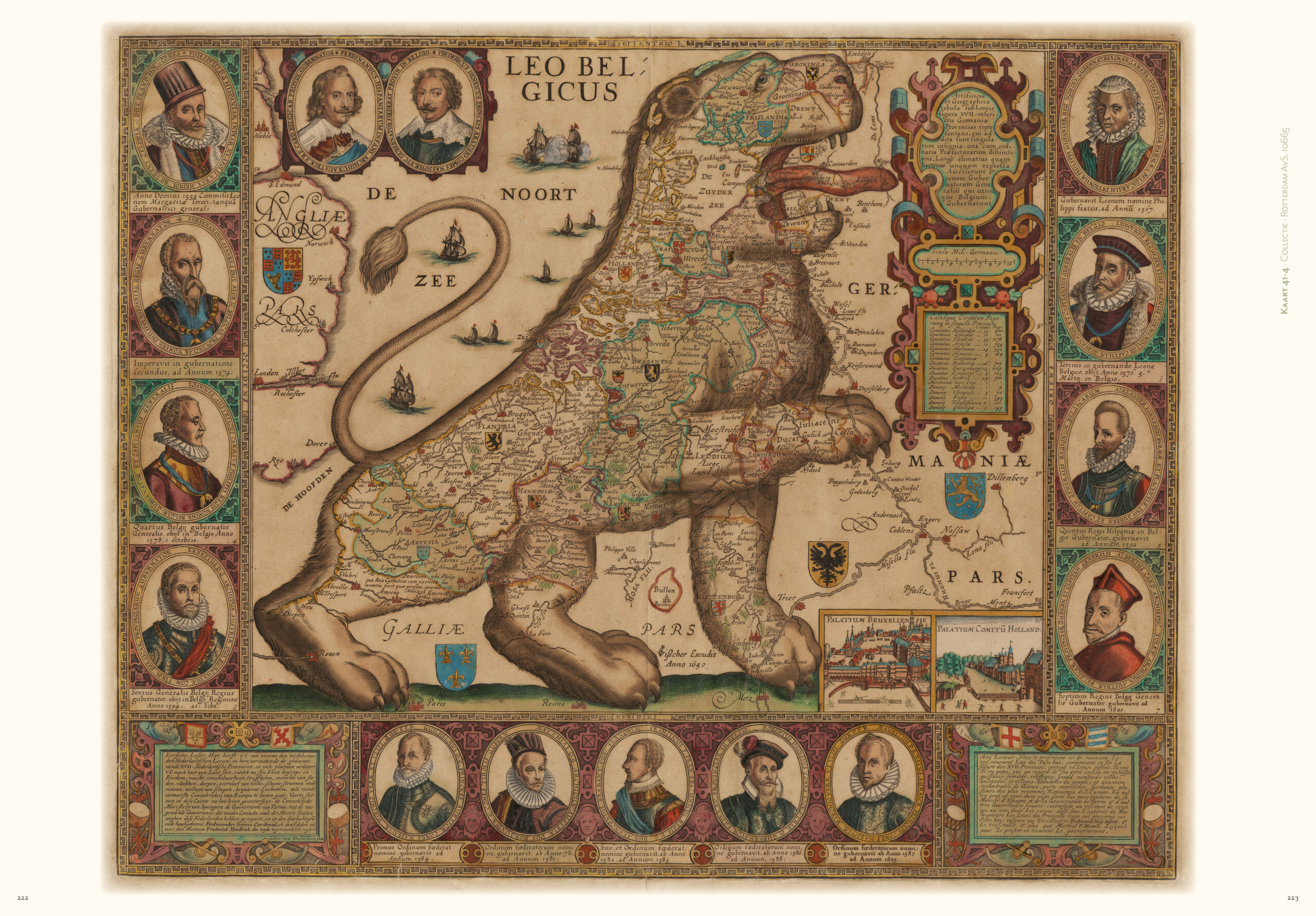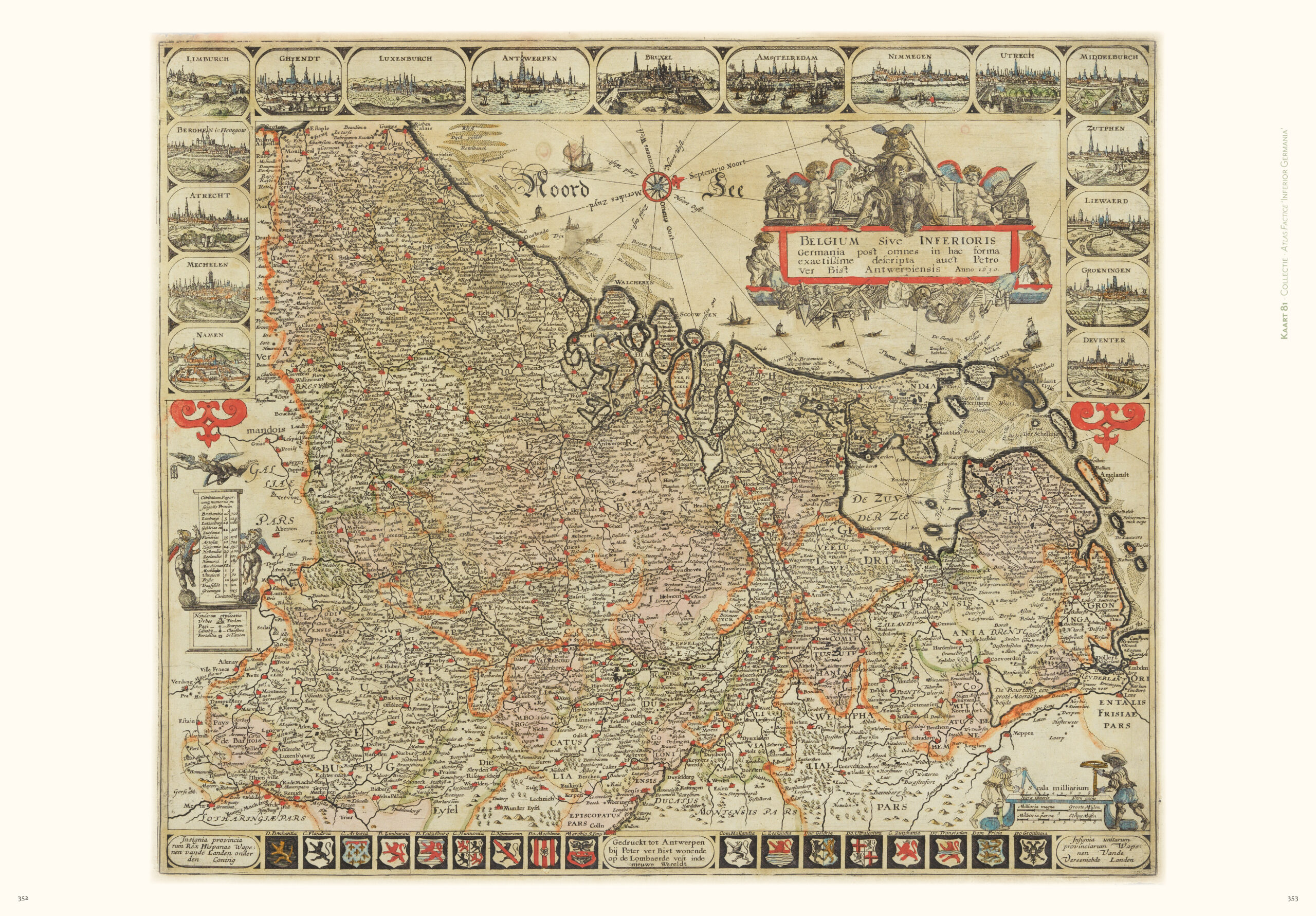 Samensteller, auteur en uitgever – Hans Spikmans: “Deze tijd, met zijn Bourgondische en Habsburgse perioden, heeft zeer instructieve, en met prachtige cartouches uitbundig geïllustreerde wandkaarten en foliokaarten opgeleverd, waarvan vele in kleur. Deze cartografie vond ook een markt elders in Europa.”